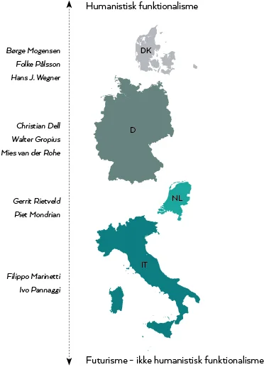 Skolen var, modsat samfundet på Loos’ tid, ideologisk tæt forbundet med rationalisme og fremskridtstro og med masseproduktionens muligheder. En ensidig stor vægt på disse begreber medfører en risiko for, at hensynet til det enkelte menneskes velfærd sættes over styr. (Bauhausfolket havde dog en tanke om at ville ”producere for folket”, men det kan diskuteres hvor vidt det lykkedes.) Længere i den retning gik den mere radikale De Stijl-bevægelse, som var bauhausfunktionalismens beslægtede og samtidige hollandske pendant, hvor blandt andre Gerrit Rietveld og Piet Mondrian udtrykte sig i kuber, primærfarver, vertikaler og horisontaler for derigennem at opnå objektivitet og orden i livet og samfundet—en stringent og følelseskold harmoni. Disse funktionalisters værker var ikke ligefrem imødekommende eller humane i deres udtryk (fig 1.2). Den mest ekstreme form for funktionalisme finder vi i den italienske futurisme, som i endnu højere grad var en hyldest til fremskridtet, maskinen og endda til militæret. Krigsførsel blev anset som katalysator for udvikling og fremskridt. Fart, bevægelse og dynamik var indbegrebet af det moderne menneske (fig 1.3).