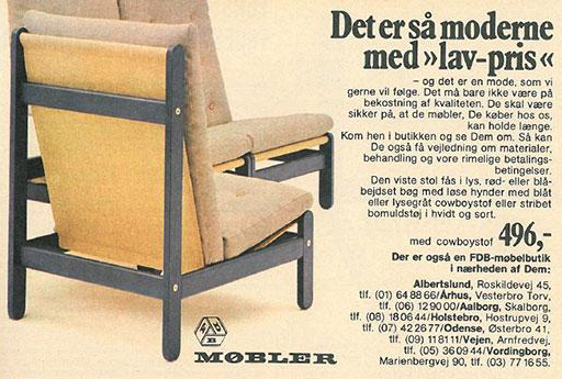Allerede i 1896 blev Fællesforeningen for Danske Brugsforeninger, FDB, etableret. FDB fik også senere stor betydning ind i funktionalismens program, for i 1942 blev Børge Mogensen ansat i FDB som tegnestuechef. Han udviklede møbelprogrammet FDB Møbler, der havde til hensigt at udnytte brugsforeningsnetværket til at få gode og billige møbler ud til større bredder af befolkningen (fig 1.4). Man brugte en overgang arbejdstitlen Folkemøbler. I begyndelsen producerede Tarm Stole & Møbelfabrik mange af fdb’s møbler. Folke Pålsson var en tid leder på fabrikken og havde altid to krav til møblerne: de skulle være smukke og funktionelle.