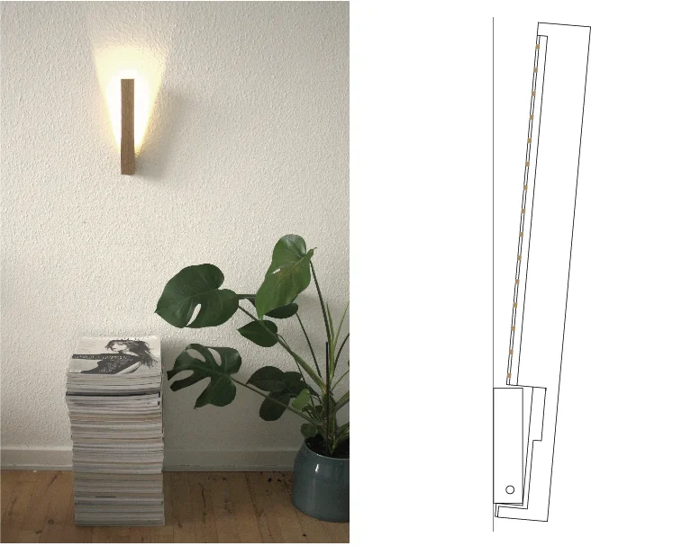 Væglampen i træ (fig 3.2) er ultraenkel. Og man kan sige næsten de samme ting om lampen, som det forrige stole-eksempel. Dog pånær en ting: det er ikke indlysende, hvordan lampen fungerer. Lampen tændes ved at trække toppen af pinden ud fra væggen i en lille vinkel. Det ses ikke ved første øjekast, men denne funktionelle detalje er det lille ekstra twist, der giver lampen sit overraskende og interessante moment. Når lampen sidder lodret klinet ind til væggen kan den næsten ikke blive mere enkel—den er umiddelbart kedelig. Men idet der interageres med lampen aktiveres funktionen og designet levendegøres. Pindens vinklede position, når den er tændt, understreger også den dynamik, der er i lampen: lodret og statisk når slukket, vinklet og dynamisk når tændt.